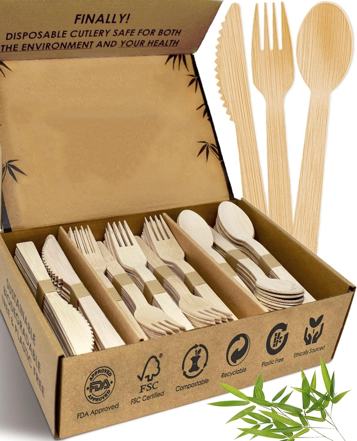 Compostable Bamboo Cutlery Set 100 Forks Spoons